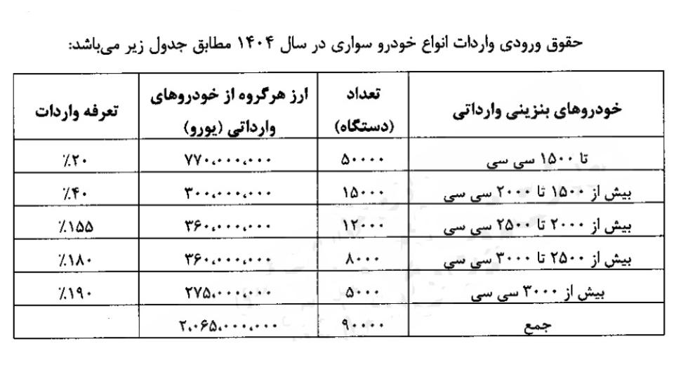 محمدعلی بهپوری، مدیرکل دفتر واردات گمرک جمهوری اسلامی ایران، اصلاحیه تصویب‌نامه 21 خرداد امسال هیأت وزیران در خصوص آیین‌نامه اجرایی بند «ر» ذیل تبصره یک ماده واحده قانون بودجه سال ١٤۰٤ کل کشور پیرامون واردات انواع خودرو در سال ١٤۰٤ را به گمرکات اجرایی کشور ابلاغ کرد.