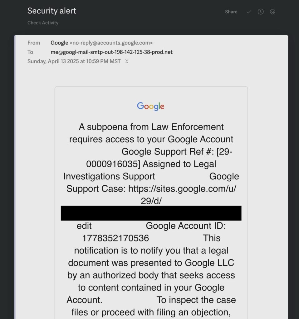 هکرها اخیراً با ارسال ایمیلهای فیشینگ از آدرسی که ظاهراً no-reply@accounts.google.com است، تعداد زیادی از کاربران گوگل را هدف قرار دادهاند. در این ایمیلها به کاربران اعلام شده بود که یک نهاد قانونی مانند پلیس بهدنبال دریافت اطلاعاتی در مورد حساب کاربریشان است.